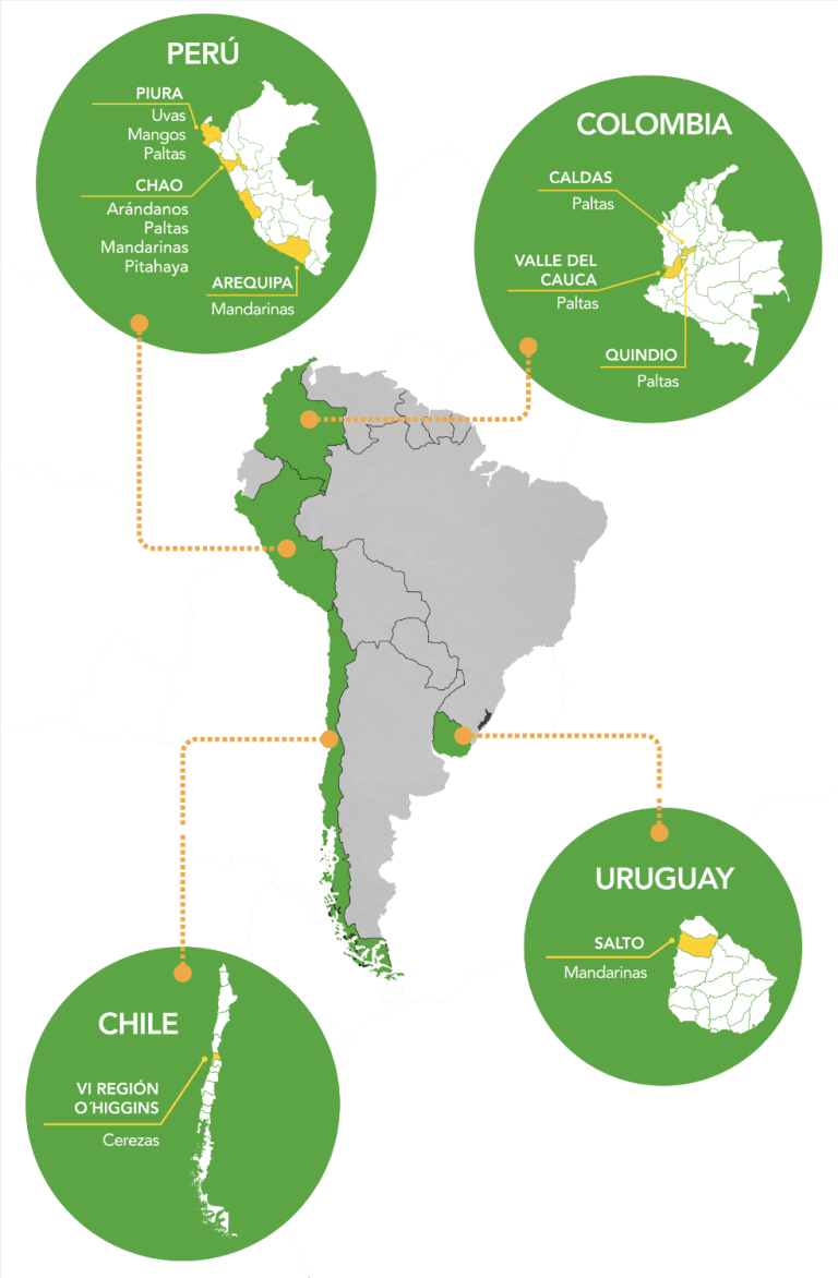 Somos una empresa peruana que ha evolucionado hasta convertirse en un referente global en el sector de alimentos frescos. Actualmente tenemos presencia en Perú, Colombia, Uruguay y Chile, y exportamos nuestros productos a más de 40 países, con operaciones en Norteamérica, Europa y Asia.